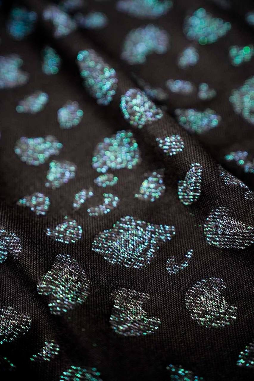 Einzigartiges Design: Die Safari Milo Babytrage kombiniert edles Schwarz mit grünen Glitzerfäden in einem atemberaubenden Leopardenprintmuster. Diese limitierte Edition ist ein echter Blickfang.